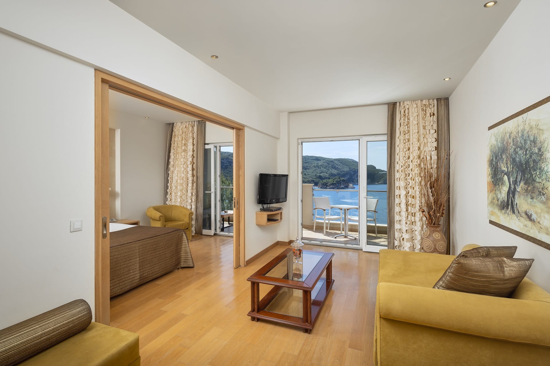 Die Zimmer haben eine Größe von ungefähr 45 m2 und der Privatbalkon bietet einen wunderschönen Blick aufs Meer. Ein Schlafzimmer verfügt über ein Doppelbett und das andere ist mit 2 Einzelbetten ausgestattet.