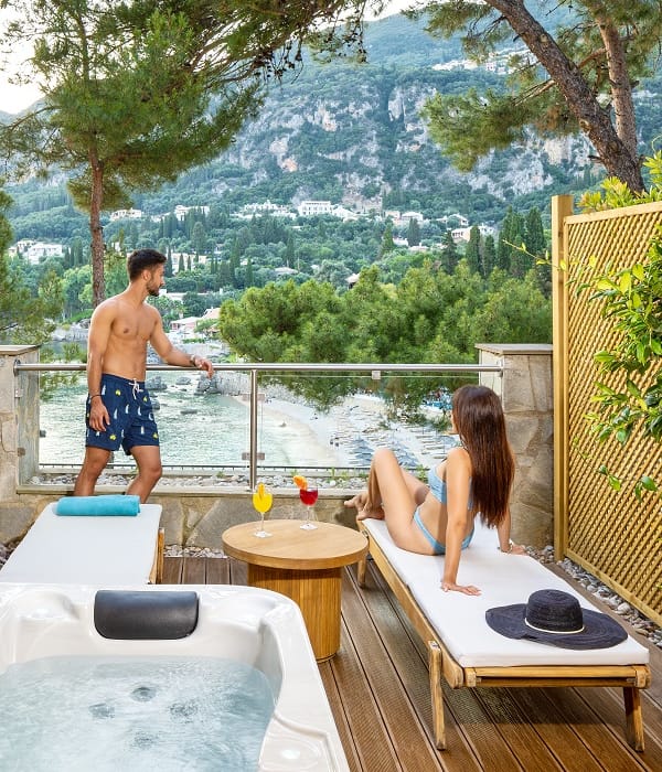 Nos Chambres avec Terrasse privée et Jacuzzi sont situées au côté ouest de l'hôtel, avec vue sur la plage d'Agia Triada et le paysage environnant. Elles ont une superficie d'environ 25m² à l'intérieur et une terrasse de 15m².